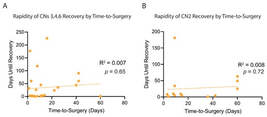Correlation of Time to Surgery and Rapidity of Postoperative Recovery. Linear regression analysis and F-Test as performed to assess correlation in (A)—CNs 3, 4, and 6, and (B)—CN2.
