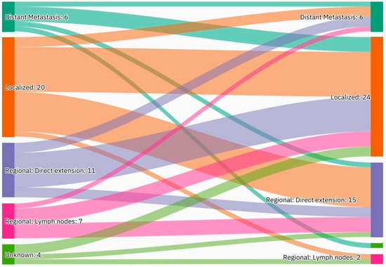 An alluvial plot showing stages of first and second primary malignancies. Detailed description: A total of 10.9% of the patients had their first primary malignancy diagnosis when it already metastasized to a distant organ, 21.8% had regional metastasis, and the rest had localized disease. A total of 16.8% of the patients had metastatic disease when diagnosed, 17.8% had regional metastasis, and the rest had localized disease.