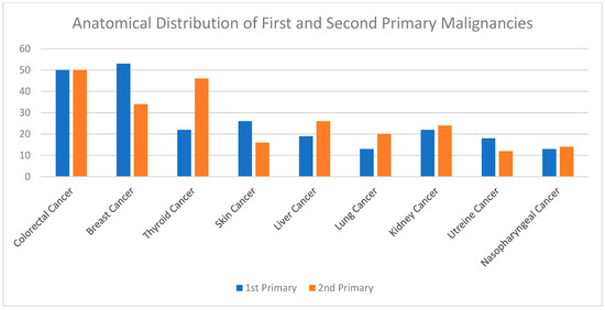 In China, the most frequently diagnosed first primary metachronous malignancies were colorectal, head and neck, and lung cancers, and the most frequently diagnosed first primary synchronous malignancies were lung, colorectal, and breast cancers [9,12,38]. Our results showed that colorectal, breast, kidney, thyroid, and liver malignancies were the most frequent synchronous malignancies, with colorectal, breast, thyroid, and skin malignancies being the most frequent metachronous malignancies. In support, in our study, colorectal cancer was the most frequent second primary malignancy, followed by thyroid, breast, liver, and kidney cancers. However, in Turkey, lung cancer was the most frequent, followed by colorectal, breast, and gynecologic cancers [26,37]. In China, colorectal cancer was the most frequent, followed by lung and breast cancers [9,12,38,39]. These findings indicate clear differences based on the country in which the study was conducted.