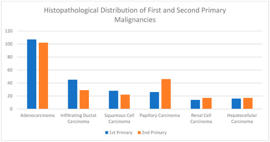Shows the most frequent histopathologic morphology of the first and second primary malignancies. Adenocarcinoma was the most common first primary histopathology, followed by infiltrating ductal carcinoma and squamous cell carcinoma. Adenocarcinoma was also the most common second primary histopathology, followed by papillary carcinoma and ductal carcinoma.