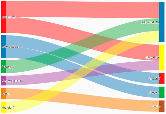 An alluvial plot showing the most frequent malignancy combinations. The most frequent malignancy combinations were breast–colorectal, breast–thyroid, kidney–colorectal, and colorectal–breast. Further frequent malignancy combinations are provided in Table 3.