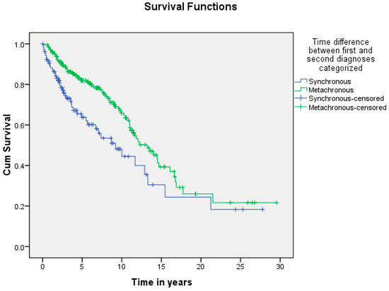 In this study, the median survival time was 9.2 and 13.2 years for synchronous and metachronous malignancies, respectively, and the difference was statistically significant (p = 0.002). This is in agreement with the literature reporting worse survival with synchronous malignancies [12,42]. A possible reason is the fluctuation of the immune system. To clarify, initially, malignancy weakens the immune system, but subsequently triggers the immune system via cytokines and the release of growth factors, eventually resulting in an exhausted and weak immune system. There is a possibility that the strengthened immunity is the cause of the longer survival in patients with metachronous MPMs. However, in patients with synchronous MPMs, due to the short interval, the immune system is seriously compromised and cannot be triggered and strengthened, compromising survival [12,43]. The differences in the survival patterns between the males and females were not significant, which is consistent with the literature [12].