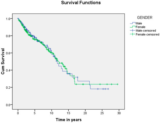 Shows the difference in survival based on patients’ gender. The median survival time in the males was 11.7 ± 1.0 years, and in the females, 11.9 ± 1.1 years, with no significant difference (p = 0.928).
