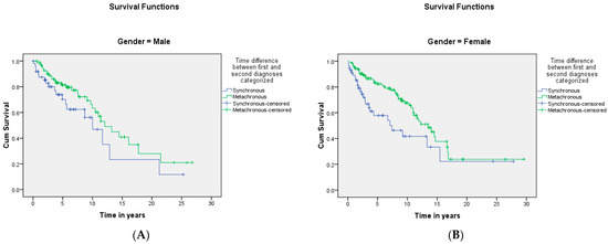 (A,B) shows the difference in survival when classified based on the MPM category by gender. The median survival time was 10 ± 1.7 and 12.1 ± 1.6 years for synchronous and metachronous malignancies, respectively, in the males, and in the females, the median survival time was 7.4 ± 2.6 and 13.5 ± 1.3 years for synchronous and metachronous malignancies, respectively. A significant difference was detected with the log-rank test (p = 0.002).