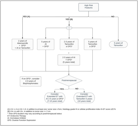 The definition of adverse clinic/pathologic features for BC recurrence varies. Within the American Society of Clinical Oncology (ASCO) guidelines, two categories of high-risk have been established based on prognostic characteristics and the likelihood rates of disease relapse [46,47]. These stipulate different high-risk thresholds, taking into consideration the benefit of therapeutic options for distinct scenarios: firstly, for any BC patient with LN+ or with LN−, in addition to tumor size ≥ 2 cm, the recommendations are to use extended endocrine therapy and/or an adjunct of ET with OFS, the latter combination being exclusively endorsed in premenopausal women. The next scenario, which involves patients with LN+ ≥ 4 or LN+ 1–3, in addition to at least one of the following characteristics—tumor size ≥ 5 cm, histology grade III, or cellular proliferation index Ki-67 ≥ 20%—fits the indication for adjuvant ET in combination with two years of Abemaciclib [47].