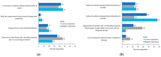 Definitions of disease progression varied widely and included a >25% increase in SV from baseline or nadir (43%), an increase in white blood cell (WBC) count, thrombocytopenia and/or worsening of anemia (36%), progression in acute myeloid leukemia (18%), or the reappearance of symptoms (4%) (Figure 2a). No consensus was reached on the definition of suboptimal response, although a trend is visible among hematologists with higher experience with ruxolitinib in MF (Figure 2b). Most participants reported suboptimal response as a failure to achieve a minimal clinical benefit at 6 months (46%) or 3 months (25%), while the onset of anemia and/or thrombocytopenia that did not allow treatment to proceed with an adequate dosage of ruxolitinib was reported by 21%.