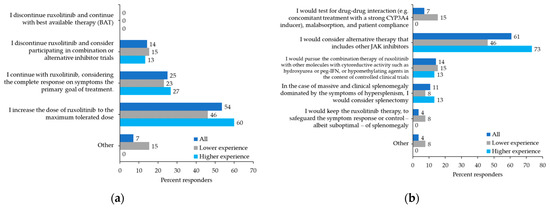 Physicians were asked about their behavior in particular situations. For MF patients receiving ruxolitinib with persistent splenomegaly and leukocytosis, 54% of physicians would increase the dose of ruxolitinib to the maximum tolerated dose, 25% would continue the same dose and consider symptoms response as the primary endpoint, and 14% would discontinue the drug and search for an alternative trial (Figure 3a). More than half of the participants (57%) would prescribe a second-line JAK2 inhibitor as soon as possible for patients with primary resistance to ruxolitinib. In comparison, 25% would anticipate switching a patient with a suboptimal response after a minimum of 3–6 months of treatment with ruxolitinib and 18% would switch a patient who developed a secondary resistance after at least 6 months of continuous ruxolitinib treatment. To manage persistent splenomegaly due to the failure to respond to an adequate or maximum tolerated dose of ruxolitinib, 61% of physicians would consider an alternative therapy including other JAK2 inhibitors. Conversely, 14% would continue with ruxolitinib associated with conventional agents, such as hydroxyurea or interferon, and 11% would consider splenectomy (Figure 3b).
