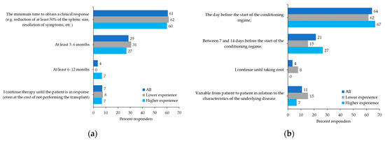 The survey included specific questions regarding the role of JAK inhibitor therapy in hematopoietic stem cell transplantation (HSCT). In detail, in an MF patient with intermediate-1 IPSS risk and an available donor, 75% of physicians believed that the leading indication for HSCT was the presence of high molecular risk (HMR) mutations, whereas only 14% would consider HSCT for resistance to JAK2 inhibitors. Regarding the second question related to the optimal length of time of JAK inhibitor treatment prior to HSCT, 61% of physicians reported the absence of a predetermined period and instead considered the minimum time to obtain a clinical response, while 29% indicated a minimum period of 3–6 months of treatment (Figure 4a).