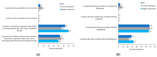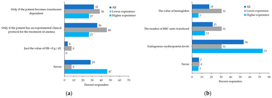 The survey also questioned how physicians would manage hematological side effects and infections in a patient with MF receiving ruxolitinib who has achieved a clinical response. For patients who develop anemia, 36% of physicians would interrupt or reduce the dose of ruxolitinib if other treatments for anemia were initiated, whereas 32% would only discontinue or reduce the dose in patients with transfusion dependence; 29% would never discontinue the drug, especially among the ones with more experience treating MF patients with ruxolitinib (Figure 5a). To manage anemia during ruxolitinib treatment, more than 40% of physicians would consider initiating concomitant treatment with erythropoietin. When asked which parameter indicated when to initiate an erythropoiesis-stimulating agent, most physicians (54% or 73% among the more experienced) would only consider endogenous erythropoietin levels (Figure 5b). Similarly, in the case of thrombocytopenia, 64% of physicians would only discontinue or reduce the dose of ruxolitinib in patients with hemorrhagic events during treatment. Alternative treatment or participation in a clinical trial was reported as the most appropriate management of severe thrombocytopenia by 68% of physicians.