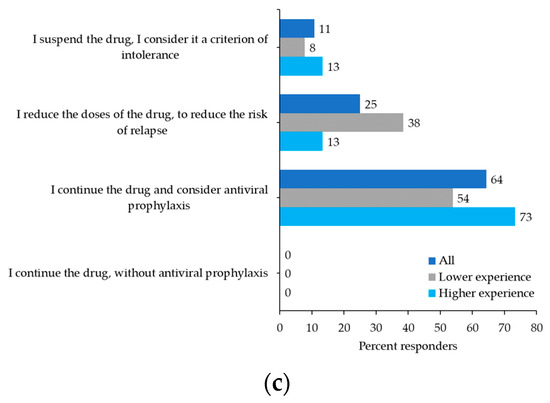 For patients with dermatologic complications and the onset of non-melanoma skin cancer (NMSC), 57% of participants would only discontinue ruxolitinib in patients with recurrent NMSCs (i.e., surgical removal of at least five lesions). There was no consensus on the management of patients with a single bacterial infectious event; 54% of participants would only consider discontinuing or reducing the dose of ruxolitinib in the absence of improvement after several days of antibiotics (Figure 6a), whereas 43% would continue ruxolitinib and only consider discontinuation or dose reduction in a patient with worsening hematologic parameters. For patients with a first episode of herpes zoster reactivation, 68% of participants would continue ruxolitinib and consider antiviral prophylaxis (Figure 6b); likewise, 64% of participants would manage treatment for patients with recurrence of herpes zoster reactivation in the same way (Figure 6c).