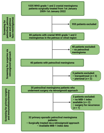 Between January 2009 and January 2022, 1035 patients underwent surgical treatment for cranial WHO grade 1 and 2 meningioma at the institutional neurosurgical clinic. Retrospective evaluation of patient data was performed after approval by the institutional review board. Inclusion criteria of this investigation were neuropathologically confirmed meningiomas, petroclival localization, an age greater than 18 years, treatment via a retrosigmoid approach, surgery for primary sporadic meningioma, and the availability of the MIB-1 index. Patients with a neurofibromatosis type 2 associated meningioma or patients who underwent a prior radiotherapy were excluded because of their different histopathology and proliferative activity [22]. Thirty-two patients were included for the final study cohort (see Figure 1).