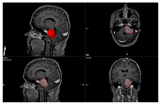 Clinical characteristics including age, sex, cranial nerve deficits, neurological functioning, body mass index (BMI), Karnofsky Performance Status (KPS), WHO grading based on neuropathological examination, extent of tumor resection based on the Simpson grading system in line with European Association of Neuro-Oncology (EANO) (Simpson grade 1–3 constitutes gross total resection, Simpson grade 4 constitutes subtotal resection, and Simpson grade 5 constitutes biopsy), and postoperative follow-up data were collected and entered into a computerized data sheet (SPSS, version 27 for Mac, IBM Corp., Armonk, NY, USA) [23]. Abducens nerve functioning was classified using the Scott and Kraft Score [24] (complete paralysis constituting a score of 1–2, incomplete paralysis constituting a score of 3–5, normal functioning constituting a score of 6). Laboratory markers were recorded using the laboratory information system Lauris (version 17.06.21, Swisslab GmbH, Berlin, Germany). Venous blood samples were routinely examined within 24 h prior to surgical treatment of PC MNG. These laboratory examinations were performed at constant time points, which enable a reliable analysis of the clinical endpoints. The routine blood examination protocol before surgical therapy included complete blood count, kidney test, liver tests, and the coagulation profile (INR, aPTT). The serum C-reactive protein values were determined by turbidimetric immunoassays with a CRPL3 reagent (Roche, Basel, Switzerland) [25]. Magnetic resonance (MR) imaging was performed in all cases within 48 h before surgical treatment. Peritumoral edema was defined as a hyperintense signal intensity adjacent to the tumor on T2-weighted MR-images [26]. MR-images were further investigated regarding the infiltration of the cavernous sinus, internal auditory canal invasion, and brainstem compression. PC MNG volume was calculated using 3D semi-automatic volumetry by the selecting the region of interest (Smartbrush® software by Brainlab AG, Feldkirchen, Bavaria, Germany). Meningioma volumes were calculated by selecting the enhancing lesion in the T1-weighted MR-images after gadolinium injection (see Figure 2).