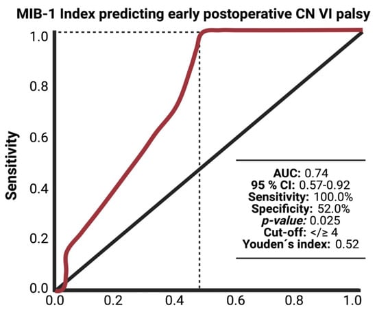 3.3. Diagnostic Performance of the MIB-1 Index in the Association with Postoperative Abducens Nerve Palsy