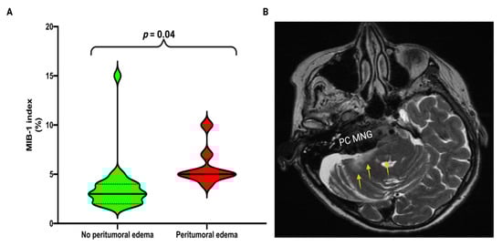 (A) Violin-plots displaying MIB-1 labeling index in patients without peritumoral edema (green) and with peritumoral edema (red) Violin plots show mean and distribution of MIB-1 index. Median values are presented by the thick black lines. (p-values of the Student’s t-test) (B) Illustrative image shows a T2-weighted MR-image of a 45-year old woman with a right-sided petroclival meningioma (PC MNG) and a new abducens nerve palsy after PC MNG surgery. The yellow arrows mark the peritumoral edema which is located in the right brachium pontis as well as in the posterior part of the pons which includes the abducens nucleus. Histopathology revealed a MIB-1 index of 7%.