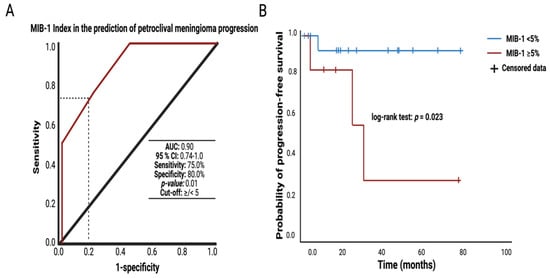 (A) Receiver-operating characteristic curve (ROC) illustrating the diagnostic power and the optimum cut-off value of the MIB-1 index in the association with petroclival meningioma progression after surgery for primary sporadic petroclival meningioma via the retrosigmoid approach. (B) Kaplan–Meier charts displaying the probability of progression-free-survival stratified by MIB-1 labeling index < 5% (blue line) and MIB-1 labeling index ≥ 5% (red line). Censored patients (stable disease at last follow-up) are indicated on the curves. The time axis right-censored at 100 months. p = 0.023 (Log-rank test).