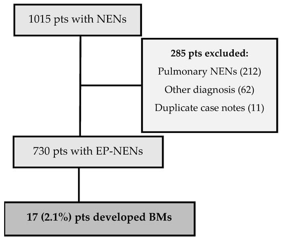 The CONSORT diagram of all new patient episodes with neuroendocrine neoplasm (NEN) diagnosis recorded and eligible patients remaining in the study following exclusions. Pts = patients. EP-NENs = extra pulmonary neuroendocrine neoplasms, BM=brain metastases.