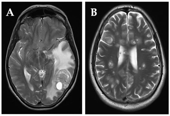 (A): T2 weighted magnetic resonance (MR) image of a solitary parietal lobe brain metastasis (BM) and vasogenic oedema; female, 67 years old, with grade 2 metastatic small bowel NEN. Patient was treated with high-dose steroids and underwent surgical resection of the solitary BM. (B): T2 weighted MR image of diffuse multiple BMs within cerebrum; male, 55 years old, with G3 metastatic NEC of unknown primary. Patient treated with high-dose steroids and best supportive care.