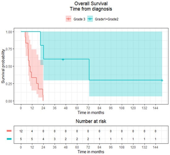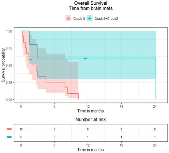 Kaplan–Meier overall survival curves of patients with extra-pulmonary neuroendocrine neoplasms and brain metastases by histological grades 1 + 2 (grouped) and 3.