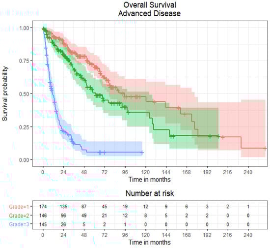 Kaplan–Meier overall survival curves of patients with advanced extra-pulmonary neuroendocrine neoplasms without brain metastases by histological grades 1, 2, and 3.