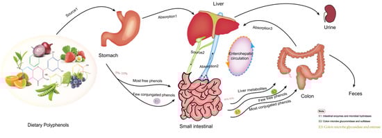Studies have verified it is not natural polyphenols that ultimately make effects on cells and tissues, which is due to the transformation of their structure and activity in the process of absorption and utilization. Most dietary polyphenols exist in food as esters, glycosides or polymers, which cannot be used directly and must be absorbed after the action of gastrointestinal flora and enzymes. In the past, the biological community generally believed that polyphenols’ digestion and metabolism mainly occurred in the small intestine. However, recent research on the morphology of polyphenols and gastrointestinal organisms have led to a new understanding of their absorption and metabolism. Figure 1 shows the absorption and metabolism of the ingested polyphenols in the body. Dietary polyphenols are divided into free and conjugated polyphenols [72]. It is estimated that only 5–10% of free phenols with a simple structure, such as aglycons, flavonol monomers or dimers, and some polyphenol sugars, are absorbed by small intestine cells [73]. Some free phenols are transformed into metabolites available for resident microorganisms to produce biomass. These metabolites may even be more bioactive than their precursors. These simple phenols undergo phase I and II reactions in intestinal cells and hepatocytes, such as methylation, glucuronidation, and sulfated derivatives, to produce many water-soluble metabolites released into blood and various organs, and finally discharged from the urine. Almost 90–95% of dietary phenols cannot be absorbed by small intestine cells [74]. Conjugated phenols, such as oligomeric and polymerized phenols with a molecular weight of nearly 40 kDa, enter the colon. Only a few are absorbed by colon cells. Most participate in the catabolism of the intestinal flora, enter the enterohepatic circulation, and are finally absorbed and utilized by the human body, thus promoting health [75].