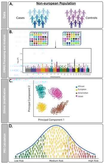 Flowchart detailing proposed steps for conducting GWAS data analysis and PRS calculation for non-European populations. (A) Genomic data can be collected from a new study of cohorts developed in multiethnic populations or from genetic information from biobanks or public repositories; (B) Genotyping assays must be performed from large-scale microarray platforms and analyzed with reliable bioinformatic tools that use safe quality controls and seek to minimize sampling bias. It is recommended that genotypic data obtained from the GWAS study be paired with information from matched reference populations from repositories such as the 1000 Genomes Project; (C) The microarray platform used must encompass genetic variants that allow for the ethnic stratification of the evaluated population (e.g., African, American, Asian, and European); (D) The PRS calculation must be performed from an individual’s genetic risk estimate to a trait or disease. The polygenic risk score (PRS) consists of an individual’s genetic risk estimate for a trait or disease, calculated through a weighted sum of allele counts, according to their genotype profile and relevant GWAS data, combined or not with non-genetic variables.