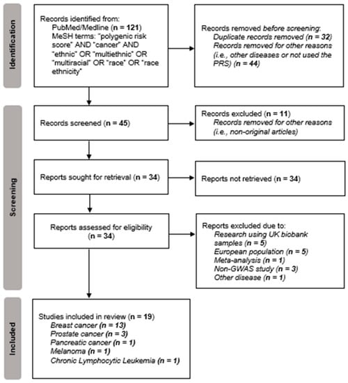 Based on the MeSH terms used, the present systematic review involved the initial retrieval of 121 article records. In the Identification step according to PRISMA [], 76 articles were excluded because they were duplicates and/or for other reasons, such as studies related to non-cancer diseases or non-original studies (Figure 2). Thus, a total of 45 articles were identified for the screening phase. According to title and/or abstract screening of the 46 articles, eleven non-original articles were excluded. All complete files of articles kept in the screening phase were obtained, to validate their eligibility (n = 34). From the remaining total of 34 articles, 15 studies related to research that used samples originating from the UK biobank (n = 5) or a European population (n = 5), or to a meta-analysis study (n = 1), or that were not related to GWAS study (n = 3) or were related to other traits or diseases (n = 1), were excluded. Finally, 19 articles were included in the systematic review (Figure 2).