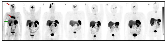 Maximum intensity projection (MIP) of 68Ga-DOTATOC before treatment of each patient. (1–8) correspond to patients treated in accordance with the rest of the article.The red arrows in patient 1 show intense uptake in all intra-cranial multifocal meningiomas and mediastinal lymph node metastases, greater than the uptake in the liver (green arrow). The remaining patients (patients 2–8) have multifocal intracranial meninigiomas also showing higher or equal uptake of Ga-DOTATOC in tumor tissue than in healthy liver tissue.