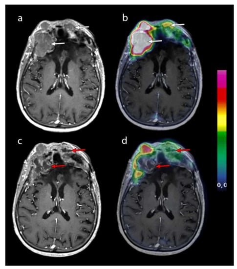 Contrast-enhanced T1-weighted axial MRI after the second cycle of PRRT (a) and after the fourth cycle of PRRT (c) was merged with 68GA-DOTATOC PET (respectively, panels (b) and (d)). Two frontal lesions (white arrows) with high 68GA-DOTATOC uptake necrotized after 4 cycles (red arrows). The question remains as to the origin of this necrosis, which may be a direct effect of PRRT or a natural necrotic tumor progression. Patient 2 was the only patient to progress with this necrotic appearance. Unequivocal progression of the other lesions was assessed according to RANO criteria on the MRI performed 4 months later.