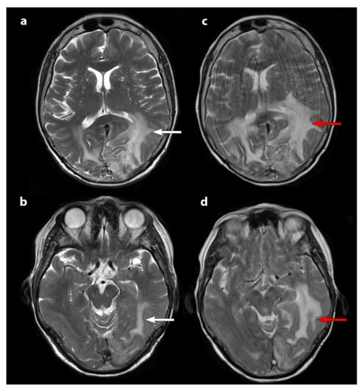 T2-weighted axial slice MRI. MRI before therapy (panels (a) and (b)) and after the second cycle of PRRT (panels (c) and (d)). White arrows show brain edema on baseline MRI which increases after the second cycle (red arrows). An increase in kinetic movements at the time of the second MRI (panels (c) and (d)) were due to the patient’s clinical deterioration in parallel with the radiological progression.