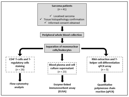 This pilot study recruited 41 newly diagnosed sarcoma patients between 13 and 68 years old from the Orthopedic Oncology Unit, University of Malaya Medical Centre (UMMC), Kuala Lumpur, Malaysia. Following the inclusion criteria, only patients with localized disease were included in this study (Figure 1). This was determined at presentation via staging studies, which included a computer tomography of the chest, bone scan, and positron emission tomography (PET) scan. PET scans are a sensitive in detecting marrow involvement. Sarcoma patients with recurrent disease, carcinoma, and non-malignant tumors, and those with comorbidities such as diabetes, ischemic heart disease, and hypertension, which could have influenced the results, were excluded from this study. The diagnosis of sarcoma was confirmed via tissue histopathology. Blood samples were taken from each patient using a standard venipuncture technique before the commencement of treatment. Twelve healthy volunteers with no significant illness (diabetes, ischemic heart disease, and hypertension) and no effective medications (inflammatory and immunotherapy medications) served as normal controls. This study includes blood samples from 10 controls and 26 sarcoma patients to compare the percentage of CD4+ T cells and Treg cells in peripheral blood using flow cytometry analysis, and 9 controls and 23 sarcomas to measure the concentration of cytokines in the plasma and culture supernatant using enzyme-linked immunosorbent assay (ELISA) (Table 1). Blood samples from five soft-tissue sarcoma patients and five normal controls were included to identify any differentially expressed genes related to T-helper cell differentiation in peripheral blood using quantitative polymerase chain reaction (qPCR) (Table 1). For qPCR analysis, we selectively collected samples from the soft-tissue sarcoma subtype to minimize variability between the patients. This pilot study was conducted following the Declaration of Helsinki. Written informed consent was obtained from patients and volunteers following the UMMC Medical Ethics Committee’s (MEC) approval (MEC number: 848.16) (Figure 1).