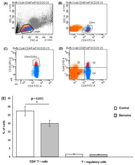 Gating strategy and flow cytometry quantification of CD4+ T cells and T-regulatory cells. PBMCs were extracellularly stained with FITC-conjugated anti-human CD4 antibody and APC-conjugated anti-human CD25 antibody and intracellularly stained with PE-conjugated anti-human FOXP3 antibody. (A) Lymphocyte population (labelled in orange) was gated from PBMCs following forward scatter (FSC) and side scatter (SSC) characteristics. (B) Gated lymphocytes were then separated into CD4+ T cells (labelled in blue). (C) CD4+CD25+ cells. (D) CD4+CD25+FoxP3+ cells (labelled in red, Q2). A minimum of 25,000 CD4+ T cells was gated for each sample during analysis. (E) Mean percentage of CD4+ T cells and Treg cells in sarcoma patients and normal controls. * Results show a significantly lower percentage (p = 0.037) of the CD4+ T cells in lymphocytes in sarcoma patients (20.18 ± 1.91%) compared to normal controls (27.76 ± 2.82%). The percentage of Treg cells in CD4+ T cells in sarcoma patients showed no significant difference (1.40 ± 0.12%) when compared to normal controls (1.53 ± 0.22%). For CD4+ T cells and Treg cells, data are represented as mean percentage of CD4+ T cells/T-lymphocytes ± standard error (SE) and Treg cells/CD4+ T cells ± standard error (SE), respectively.