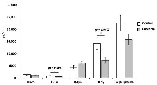 The level of TNF-α (p = 0.004) and IFN-γ (p = 0.010) in the Con-A-stimulated PBL culture supernatant from sarcoma patients was significantly lower than in normal controls (Table 3). There was no significant difference in the concentrations of IL-17A (p = 0.414) or TGF-β1 (p = 0.325) in the culture supernatants from the PBLs of sarcoma patients compared to normal controls (Figure 3). Plasma levels of TGF-β1 in sarcoma patients tended to be lower than the normal controls, but did not reach statistical significance (p = 0.098) (Figure 3). The concentration of other plasma cytokines, namely, TNF-α, IFN-γ, and IL-17A in sarcoma patients and normal controls, could not be determined as these cytokines were lower than the detection limit of the ELISA kits. The dot-point version of the bar chart is provided as Supplementary Data (Figure S4).