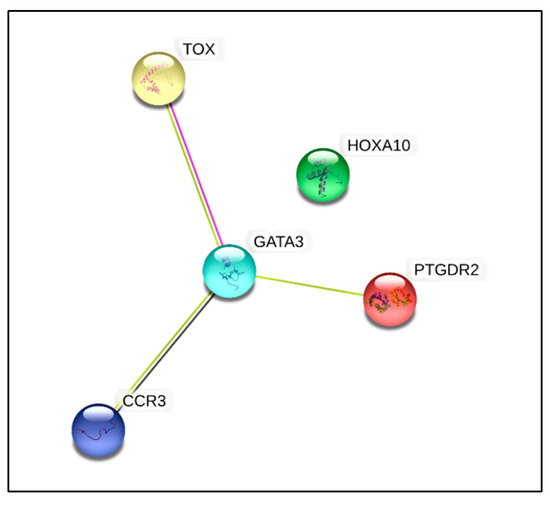 The results from the qPCR analysis showed aberrant expression of 14 genes from 84 essential genes that were annotated in the commercial T-helper cell differentiation qPCR array used in this study (Supplementary Data; Figure S5). Of these 14 genes, the expression of five genes was shown to be significantly dysregulated (p < 0.05), where four genes (GATA binding protein 3 (GATA3) (NM_002051), thymocyte selection associated high mobility group box (TOX) (NM_014729), prostaglandin D2 receptor 2 (PTGDR2) (NM_004778), and C-C motif chemokine receptor 3 (CCR3) (NM_001837)) were found to be downregulated by two-fold (p < 0.05). These genes could be linked to various gene groups that included cytokine and receptors, Th2 subtype markers, transcriptional factors, and epigenetically regulated genes (Table 6). Only one gene (homeobox A10 (HOXA10) (NM_018951)), which was upregulated by two-fold (p < 0.05), belonged to two gene groups: the transcriptional factor and epigenetically regulated genes (Table 6). The Search Tool for the Retrieval of Interacting Genes/Proteins (STRING Consortium 2022) (Version 11.5) (https://string-db.org/ (accessed on 20 May 2022)) software was used to predict the protein–protein interaction (PIP) in a virtual situation to show the vital interactions as well as possible signaling pathways that these dysregulated genes affect [25] (Figure 4).