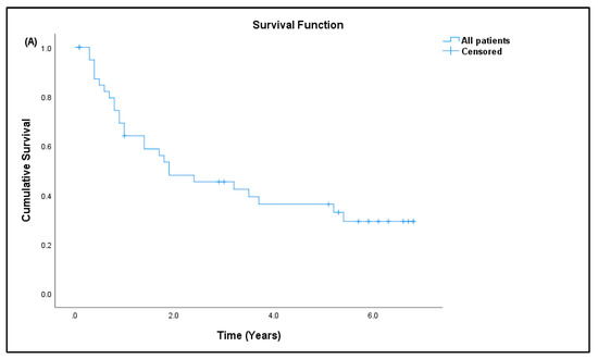 Out of 41 patients, 26 patients (63.41%) have passed away, out of which 24 (92.31%) died due to advanced disease, and two (7.69%) died due to other causes. Fifteen patients (36.59%) are still alive. Most patients survived for two years or less from the time of diagnosis (Table 7). The median survival rate of all sarcoma patients in this study was 1.9 years (95% CI: 0.17, 3.63), and the five-year survival rate was 36.6% (Figure 5a). The median for disease-specific survival for patients who died due to advanced disease was also 1.9 years (95% CI: 0.22, 3.58), with five-year survival at 38.5% (Figure 5b). The median survival for patients tested for CD4+ T cells was 2.4 years (95% CI: 0.00, 5.75), with five-year survival rate at 30.8% (Figure 5c). There was significant difference in the survival rate of sarcoma patients with hematological abnormalities of leukocytosis (p = 0.005), thrombocytosis (p = 0.001), and low red blood cells (p = 0.032) when compared to the standard reference range (Figure 6).