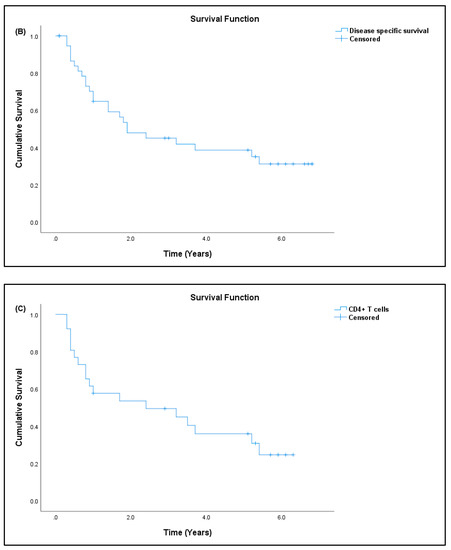 Kaplan–Meier curve for overall survival. (A) All sarcoma patients, (B) disease-specific sarcoma patients, and (C) patients tested for CD4+ T-cell/lymphocyte percentage.
