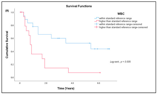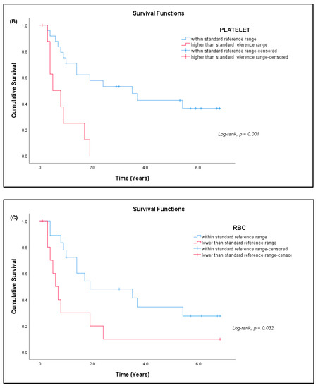 Kaplan–Meier curve for cumulative survival estimates among sarcoma patients by hematological abnormalities. (A) White blood cells (WBC), (B) platelets, and (C) red blood cells (RBC) when compared with the standard reference range (n = 33).