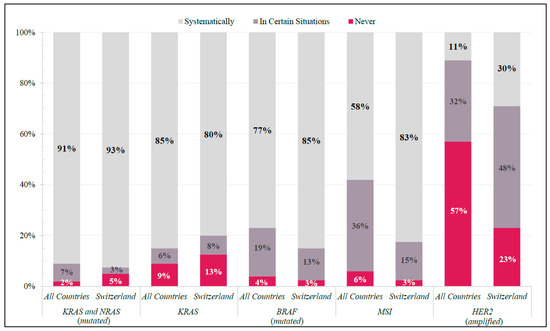 KRAS, NRAS, BRAF, and microsatellite instability (MSI) testing were systematically requested for mCRC patients by ≥80% of Swiss physicians, whereas HER2 was not (30%) (Figure 1). Internationally, KRAS and NRAS and BRAF testing were systematically requested by ≥91% and ≥77%, respectively. MSI and HER2 tests were not systematically requested among all global participants (MSI: ≤58%; HER2: ≤11%) (Figure 1).