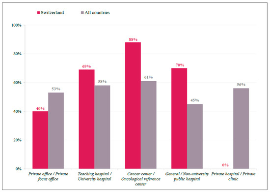 There were seven countries where >2/3 of physicians responded on tumor sidedness as having a high impact on clinical decision making: Austria, Switzerland, Croatia, Hungary, Italy, Argentina, and Germany. In Switzerland, 70% of physicians indicated tumor sidedness as a factor with a high impact, which was approximately 14% higher than that observed in all other countries (56%) (Figure S1). In addition, tumor-sidedness seemed to be more important for Swiss physicians working in cancer centers (88%) than in general/university hospitals (70%), and an even lower preference for this factor was seen among international respondents in general/university hospitals (45%) (Figure 2).