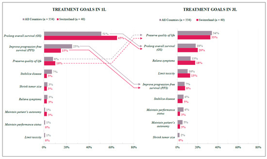 In Switzerland, physicians’ treatment goals differed between the first and third lines but were overall homogenous with international findings. For the 1L treatment, efficacy is the primary goal: Prolonging overall survival was ranked as the top priority by most respondents (SWI 65%; INT 51%), followed by improving progression-free survival (SWI 15%; INT 25%). In 3L, one-third of respondents listed quality of life results as the primary goal (SWI 33%; INT 34%), followed by prolonged overall survival (SWI 20%; INT 18%) and relieving symptoms (SWI 18%; INT 13%) (Figure 3).