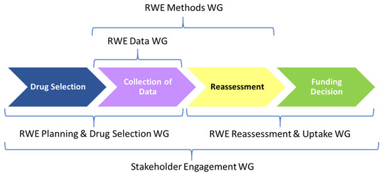 As is shown schematically in Figure 2, the Planning and Drug Selection WG and the Reassessment and Uptake WG produced an interim policy report through a series of in-person and teleconference meetings [1]. This interim policy report describes the factors to be considered in determining the feasibility of potential RWE projects and conducting a reassessment review, as well as preliminary models for the identification and selection of RWE projects and the reassessment process. Similarly, the Data WG produced an interim report based on its review of publicly available databases and the data elements within these databases that could potentially be used to undertake RWE studies [2]. The Data WG also identified where enhancements to data collection would need to be made to support such studies.