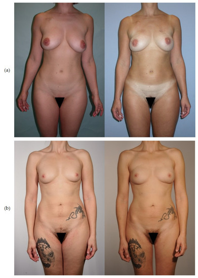 (Left) Preoperative and (right) post-operative views of bilateral breast reconstruction with donor-site in the thigh region: (a) TMG flap and (b) PAP flap.