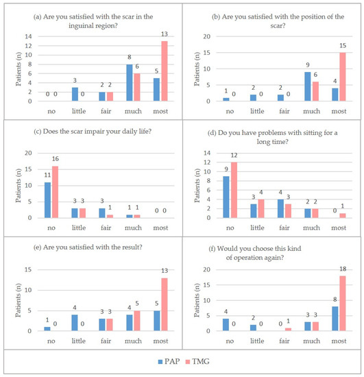 Satisfaction with the scar in the inguinal region was in both groups rather positively rated, with “much” being the leading response in the PAP group (44.4%) and “most” in the TMG group (59.1%). Still, the TMG group was significantly more satisfied with the scar (p = 0.015) and its position (p = 0.001) (Figure 2a,b). Comparison of the two patient groups showed equivalent results concerning patient-reported visibility of the donor-site scar (Table 3; Questions 3–7) and thigh symmetry (Table 3; Questions 8–10). PAP patients significantly more often reported wound-healing problems than did TMG patients (2.56 ± 1.37 points versus 1.41 ± 0.94 points; p = 0.004). Questions 14–30 (Table 3) asked about scar-evoked afflictions. The PAP group reported a higher prevalence (p = 0.006) of sensory deficits (3.29 ± 1.32 points) than did the TMG group (2.09 ± 1.24 points). Sensitivity to cold and pressure were rated similarly, with both groups choosing “no” as the leading response (Table 3; Questions 16–18). No difference was found concerning the ability to sit for prolonged periods, with the majority of patients in both groups choosing “no” (50.5% in the PAP and 54.5% in the TMG group) or “a little” (16.7% in the PAP and 18.2% in the TMG group) (Figure 2d). In the PAP group six patients complained of being restricted in their leisure activities such as bike-riding, stretching, hiking and climbing. When asked about their willingness to choose this kind of operation again, 61.1% of the patients in the PAP group chose the responses “much” and most”, while 95.5% of the patients in the TMG group chose one of these options (p = 0.002; Table 3 and Figure 2f).