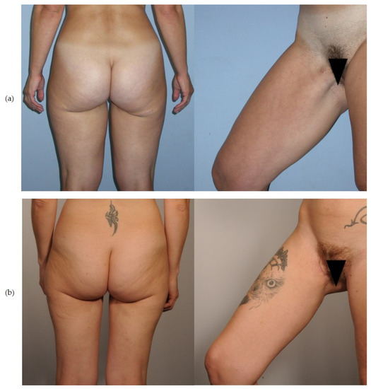 Evaluation of thigh symmetry and appearance of the scars based on standardized photo documentation showed better results in PAP patients, while thigh shape was rated better in TMG patients (Figure 3).