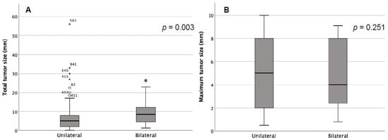 Total tumor size (A) and maximum tumor size (B) in unilateral and bilateral tumor manifestation. * statistically significant.