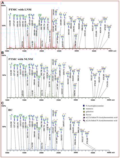 The representative matrix-assisted laser desorption/ionization time-of-flight mass spectrometry (MALDI-TOF-MS) spectra of serum protein N-glycome for (A) PTMC with LNM, (B) PTMC with NLNM, and (C) HC. Spectra were recorded in positive-ion reflection mode on a Bruker rapifleXtreme mass spectrometer. Major N-glycan peaks are annotated and assigned to compositions, and the presence of structural isomers cannot be excluded. The asterisks (*) represent by-products. Abbreviations: PTMC, papillary thyroid microcarcinoma; LNM, lymph node metastasis; NLNM, non-lymph node metastasis; HC, healthy control.