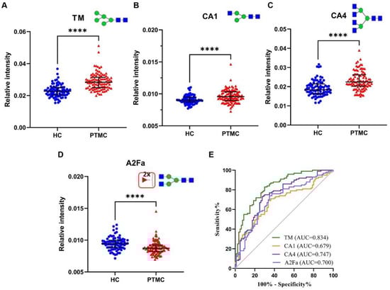 The scatter plots and ROC curve analysis of four prominently different derived N-glycan traits between PTMC and HC groups. (A) scatter plot for TM, (B) scatter plot for CA1, (C) scatter plot for CA4, (D) scatter plot for A2Fa, and (E) ROC curve analysis for four differential expressed derived glycan traits. **** represents p-value < 0.0001 (after multiple testing correction). Notes: mannose, green circle; fucose, red triangle; GlcNAc, blue square. Abbreviations: ROC, receiver operating characteristic; PTMC, papillary thyroid microcarcinoma; HC, healthy control; AUC, area under the curve.