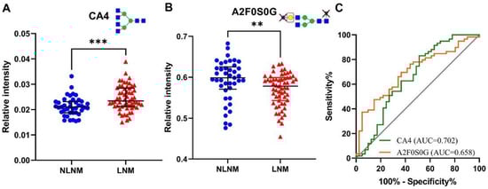 The scatter plots and ROC curve analysis of two prominently different derived N-glycan traits between PTMC with LNM and with non-LNM groups. (A) scatter plot for CA4, (B) scatter plot for A2F0S0G, and (C) ROC curve analysis for two differential expressed derived glycan traits. *** represents p-value < 0.001, ** represents p-value < 0.01 (after multiple testing correction). Notes: mannose, green circle; GlcNAc, blue square; fucose, red triangle; galactose, yellow circle; sialic acid, purple diamond. Abbreviations: ROC, receiver operating characteristic; PTMC, papillary thyroid microcarcinoma; LNM, lymph node metastasis; AUC, area under the curve.