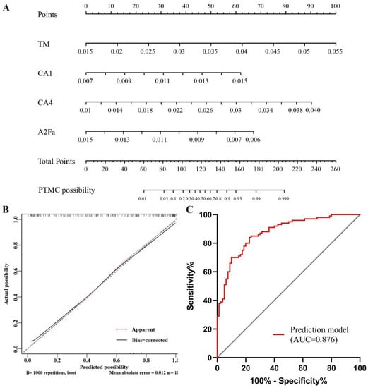 Though the PTMC-associated glycan traits were identified, the diagnostic accuracy of each N-glycan trait was underpowered. Then, we screened out four derived glycan traits (TM, CA1, CA4, and A2Fa) which were significantly associated with PTMC, based on which, a nomogram was established as a model for the diagnosis of PTMC. The AUC value of our nomogram was greater than 0.8, and has superior accuracy. Patients with a total point value of more than 0.746 (cutoff) are more likely to be diagnosed with PTMC. Hence, this nomogram can provide surgeons with a quantitative tool for PTMC diagnosis, assisting existing approaches (ultrasound and FNAB).