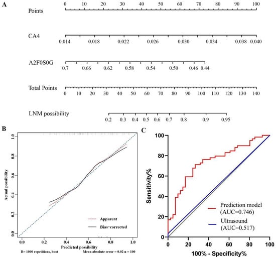 Based on the four N-glycan traits (TM, CA1, CA4, and A2Fa) that were significantly associated with PTMC in multivariate analysis, the logistic regression models were created and visualized as nomograms to provide a quantitative method for the diagnosis of PTMC (Figure 4A). A Hosmer–Lemeshow goodness-of-fit test was used to confirm the consistency of the nomogram (χ2 =2.012, df = 8, p =0.9806). The calibration curve indicated a satisfying agreement between predictions performed by the nomogram and actual outcomes in the cohort (Figure 4B). The AUC of the model was 0.876 (95% CI, 0.819-0.920) (Figure 4C). The optimal cutoff value for diagnosis of PTMC is 0.746, which was determined by the Youden method (sensitivity, 84.0%; specificity, 77.5%; negative predictive value, 82.4%; positive predictive value, 79.5%). The existing method for detecting LNM is ultrasound, which has a sensitivity of 20–38% [17]. Considering that CA4 and A2F0S0G showed strong associations with LNM in PTMC, we built a nomogram for the preoperative prediction of LNM in PTMC based on the two glycan traits (Figure 5A). The consistency of the nomogram was assessed by the Hosmer–Lemeshow goodness-of-fit test (χ2 =7.145, df = 8, p = 0.516). The calibration curves of the model demonstrated a satisfying agreement between nomogram and observed outcomes (Figure 5B). The AUC of the model was 0.746 (95% CI, 0.649–0.828) (Figure 5C). The optimal cutoff value of the nomogram for the prediction of LNM was 0.534 (sensitivity, 71.2%; specificity, 73.2%; negative predictive value, 79.2%; positive predictive value, 63.8%). Additionally, our results indicated that the AUC value of ultrasound in predicting metastasis was 0.517 based on the clinical and ultrasound data of patients in our study.