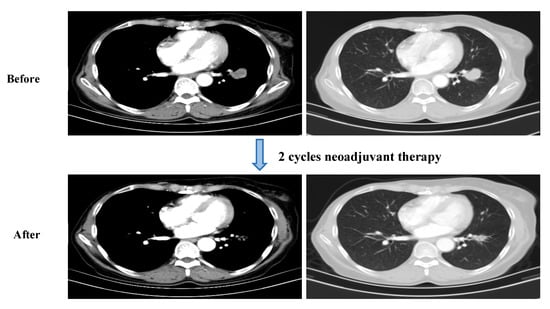 Second, we administered neoadjuvant chemoimmunotherapy rather than chemotherapy. Preoperative chemotherapy, as reported, can shrink tumors, improve complete resection rates, decrease postoperative recurrence rates, and provide better survival outcomes than surgery alone [,]. However, the benefit of chemotherapy is limited and there is an urgent need for well-tolerated and effective neoadjuvant therapies. A recent meta-analysis based on perioperative clinical data demonstrated that neoadjuvant immunotherapy was feasible, safe and had a long-lasting effect. Some studies demonstrated an obvious and permanent increase in antitumor T cells in peripheral blood (even after the primary tumor was removed) using neoadjuvant immunotherapy []. In addition, some trials indicated the presence of a synergetic effect of neoadjuvant immunotherapy and chemotherapy []. The CheckMate 816 trial (ClinicalTrials.gov identifier NCT02998528), in which 358 patients with stage IB0-IIIA NSCLC were randomized to receive either three cycles of neoadjuvant chemotherapy or three cycles of chemotherapy with nivolumab, reported a major pathological response (MPR) rate of 36.9% and a pCR rate of 24% []. This pattern significantly improved the outcomes in IIIA NSCLC patients with multi-station N2 lymph node metastases []. The trial presented promising implications for the safety of this regimen.